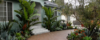The home is light blue in color and, with all of the blues and grays for the drought tolerant plantings used in the garden, he wanted to off set them with plantings of bright orange Kangaroo Paws.